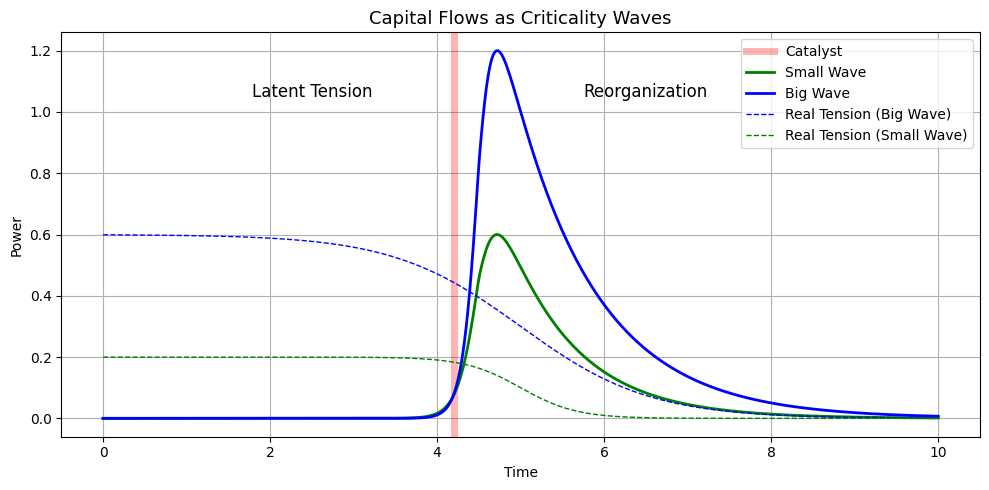 What makes investing both exciting and challenging is that the seeds of change, and thus the potential of outsized returns, already exist, but often remain latent and imperceivable to all but a few. We think of criticality like a wave. Imagine two distinct waves, one large (blue wave, below) and one smaller (green wave, below)—the flow of capital and subsequent market re-organization is proportional to the intensity of the tension “revealed” by the catalyst (dotted lines) and the strength of the investor perception/narrative that is generated (see here for more technical simulation). The waves decay at varying rates when tensions are resolved (note that meta-waves like cloud computing or AI can last for decades).