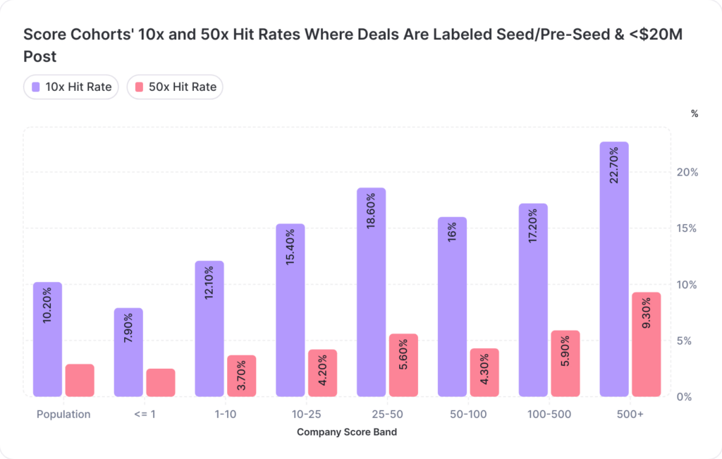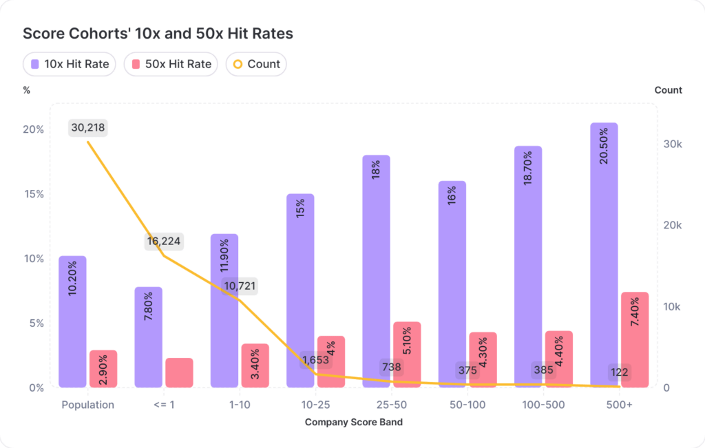 🏆 The 500+ score band has the highest hit rates: the 10x hit rate was double the population average (20.5% vs 10.2%) and the 50x hit rate nears triple (7.4% vs 2.9%). These results indicate that higher scores indicate better performance.