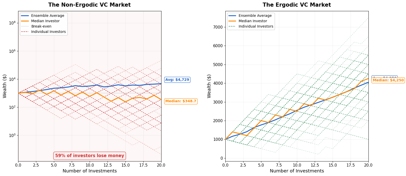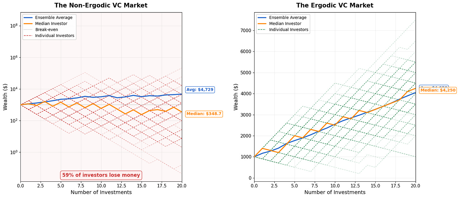 Non‑ergodic (left): The ensemble average looks great on paper (because the power law means a few investors hit extreme right-tail outcomes). But the median investor’s wealth collapses and ~59% of investors lose money. The few massive winners drag the average up while most go broke. This is multiplicative dynamics (repeated percentage gains/losses)—what happens to the typical VC investor diverges wildly from the average. Ergodic (right): Ensemble average ≈ median. Every individual’s trajectory clusters around the mean and the time average and the ensemble average converge.
